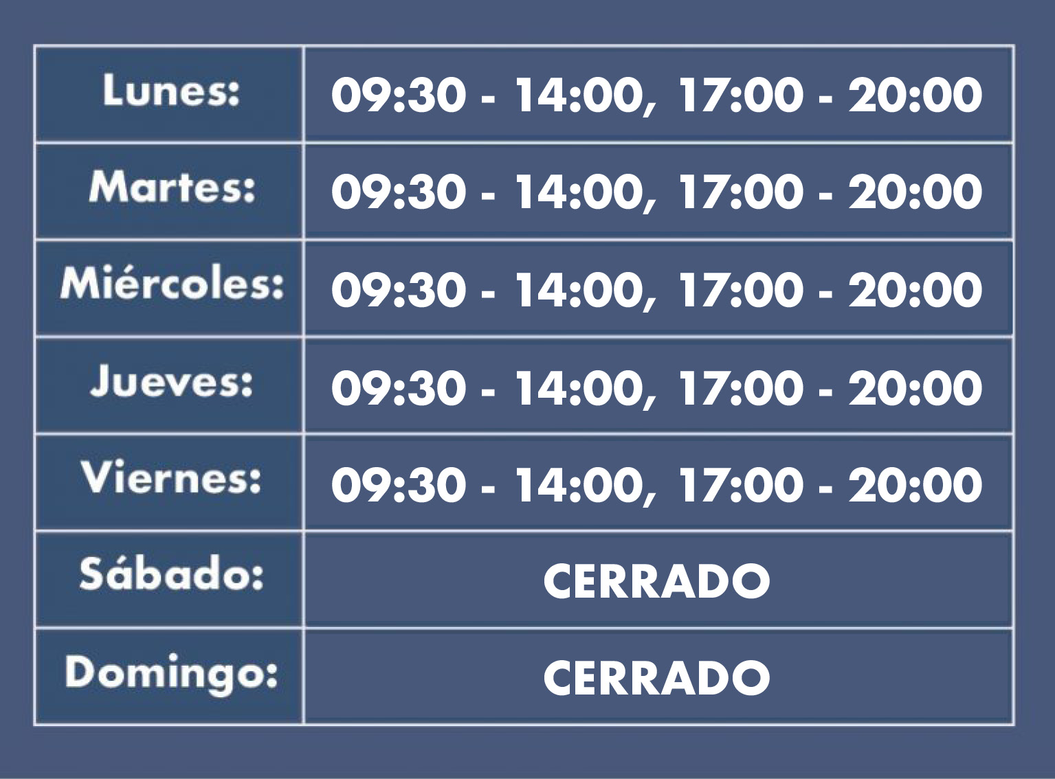 Lunes a viernes de 9:30 h. a 14:00 h. – 17:00 h. a 20:00 h.